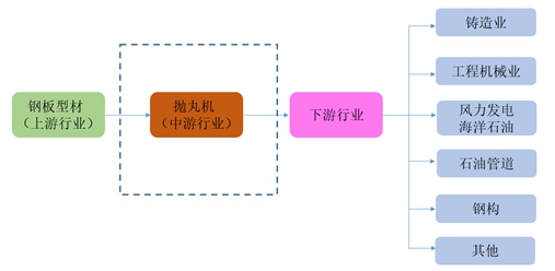 拋丸機行業上游主要是原材料供應商鋼鐵(鋼板、型材),行業下游主要包括機械、汽車、飛機、摩托車、鐵路機車、造船、集裝箱、橋梁、化工、建筑等制造行業中的鑄件、鍛件、鋼材、型鋼的清砂與除銹,拋丸清理與表面強化。