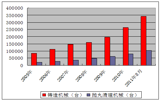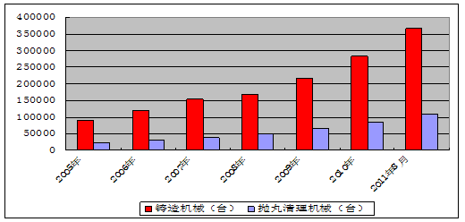 2005年我國拋丸機產量為22789臺套,截至2011年8月末,我國拋丸機產量已達110000臺套,年均增長26%。