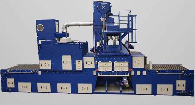 鋼板拋丸機是多數板材軋鋼廠必備的基礎設備,現在使用的都是輥道式鋼板拋丸機,它將不同厚度的一張張鋼板連續自動的進行表面潔凈處理,然后按照客戶要求進一步熱處理或防腐處理。鋼板拋丸機通過高速旋轉的拋頭葉輪將鋼丸以高速度拋投到鋼板表面,擊打磨削鋼板表面。拋頭分布在鋼板運輸輥道上下兩側,錯落放置。根據鋼板寬度的不同上下兩側的拋頭也不相同,同時調節鋼板在輥道上的傳輸速度和控制拋頭的鋼丸量,能對移動中的鋼板進行完美的拋丸處理。